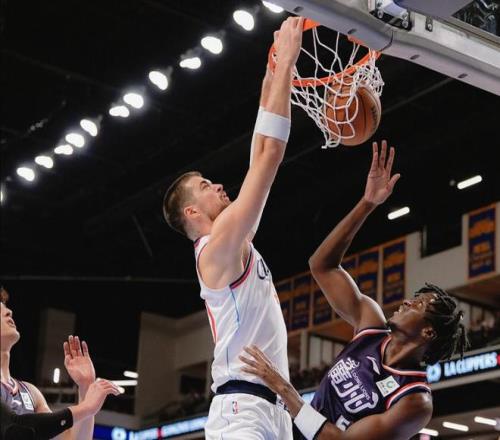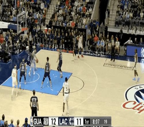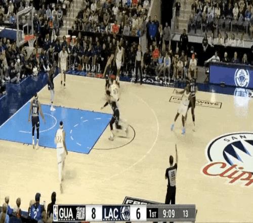 比赛第一节,快船中锋祖巴茨连续篮下隔扣广州球员李祥波和奥拉迪波。