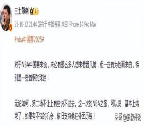 媒体人三土带刺发文表示:对于NBA中国赛来说,未必有那么多人想来看曾凡博,但一定有为他而来的,特别是一些首钢的球迷!
