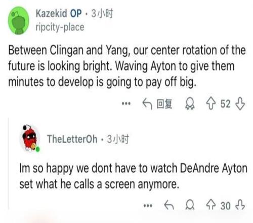 一位网友说:在克林根和杨瀚森之间,我们的未来中锋轮换真是前景光明。裁掉艾顿,让他们有更多时间成长,这个决定迟早会有大回报。