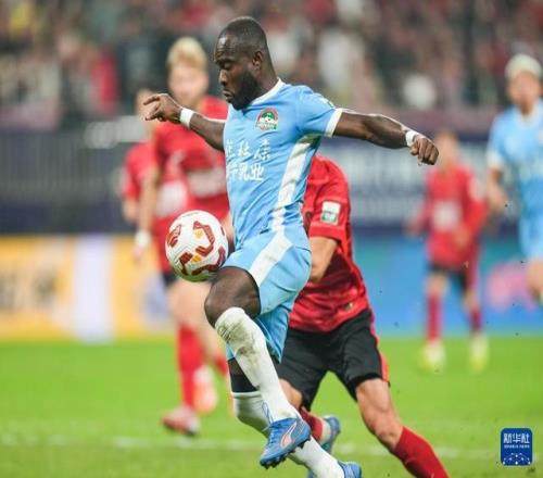 10月31日,河南俱乐部酒祖杜康队球员纳萨里奥(右一)在比赛中射门。新华社记者 王曦 摄