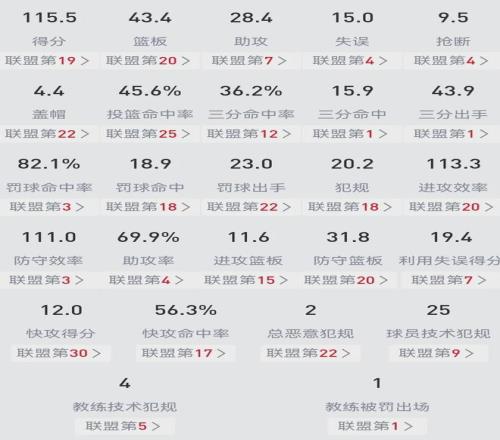 目前为止,勇士以21胜18负排在西部第八,场均得分115.5联盟第19,进攻效率113.3第20,场均三分出手(43.9)和命中数(15.9)均高居榜首,防守效率111.0第三,篮板43.4第20等等。