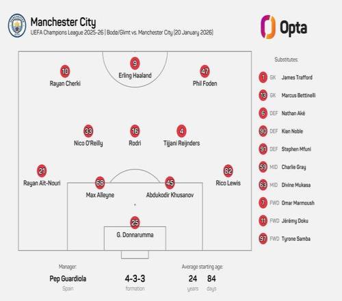 北京时间1月21日,欧冠联赛阶段第7轮曼城做客挑战博德闪耀,此战瓜迪奥拉派出的首发阵容创造了蓝月亮在欧冠的一项纪录。